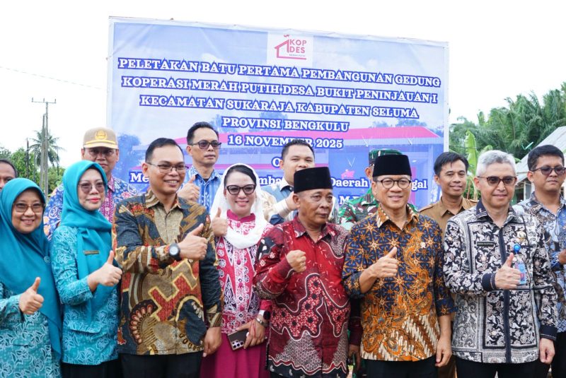 Seluma – Anggota Dewan Perwakilan Daerah Republik Indonesia (DPD RI) Provinsi Bengkulu, Apt. Destita Khairilisani, S.Farm., MSM., mendampingi Menteri Desa dan Pembangunan Daerah Tertinggal (Mendes PDT) Yandri Susanto dalam peletakan batu pertama pembangunan Koperasi Desa Merah Putih (KDMP) di Desa Bukit Peninjauan I, Kecamatan Sukaraja, Kabupaten Seluma, Minggu (16/11).