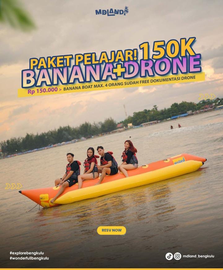 Bengkulu – MD Land, salah satu destinasi wisata populer di Bengkulu, kembali menghadirkan promo menarik guna menarik minat wisatawan, khususnya dari kalangan milenial dan pelajar. Kali ini, mereka meluncurkan “Paket Pelajar” yang menawarkan pengalaman seru bermain banana boat lengkap dengan dokumentasi udara.